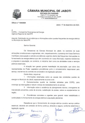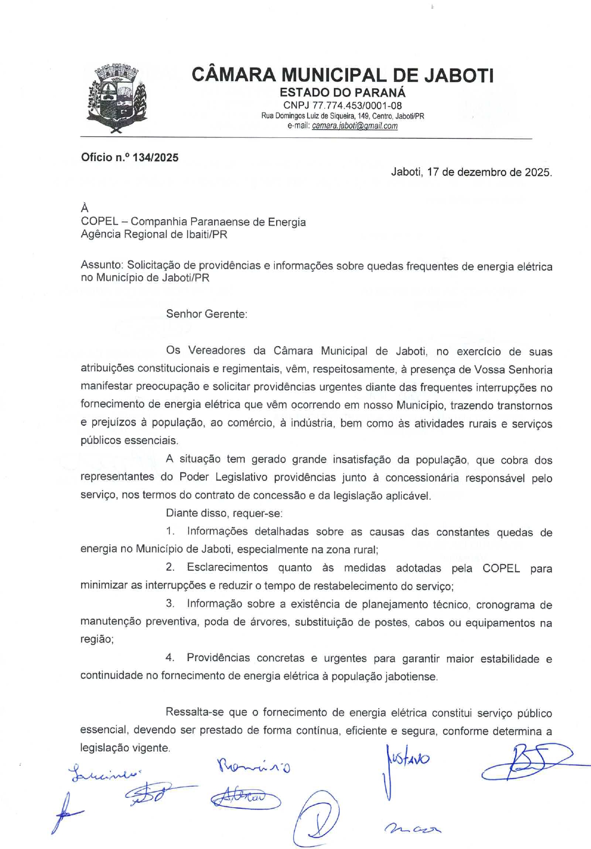 Câmara Municipal de Jaboti encaminha ofício à Copel cobrando providências sobre fornecimento de energia elétrica
